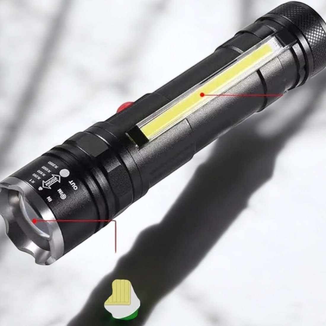 - COB Side Light: Strong Light, Flashing Mode (for emergencies)